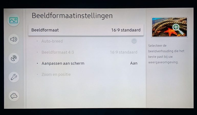 - ‘Beeldformaatinstellingen’: selecteer ‘beeldformaat 16:9 standaard’ en zet ‘Aanpassen aan scherm’ aan, zo vermijd je dat de buitenste rand van het beeld afgesneden wordt.