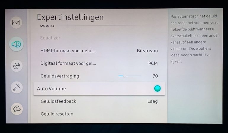 - ‘Auto Volume’: Stoort het je dat verschillende bronnen en programma’s vaak een ander geluidsvolume hanteren? Activeer dan ‘Auto volume’, deze instelling nivelleert de grootste verschillen..