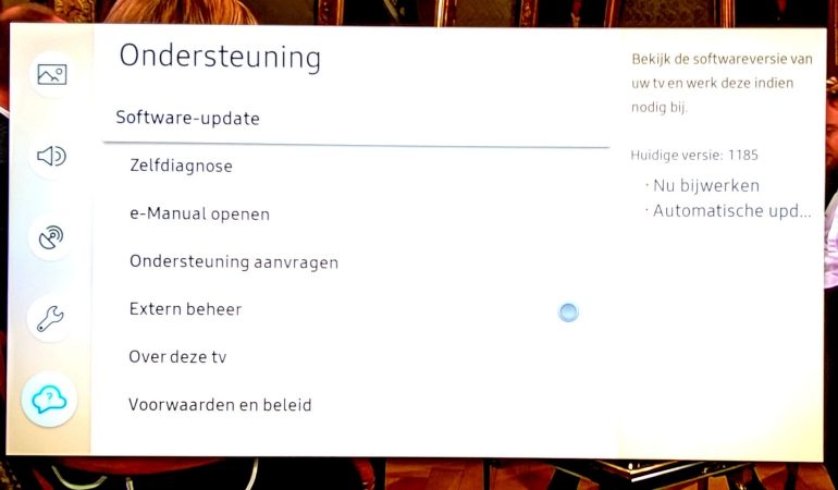 - ‘Als je Software-update’ of onderdelen van ‘Zelfdiagnose’ (zoals een reset) wilt uitvoeren, dan mag de huidige bron niet de app-store of een app zijn want dan zijn die opties uitgegrijsd. Kies de ingebouwde tuner of een HDMI ingang.