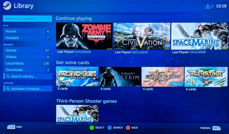 Steam Link: Speel de games uit je Steam-bibliotheek op het grote scherm. Je computer draait het spel, en de beelden worden via het thuisnetwerk naar de tv gestuurd. Je kan met keyboard en muis of met gamepad spelen.