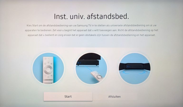 De Smart Controller dient ook als universele remote voor je randapparaten. Open de Smart Hub, ga naar Bronnen (voorlaatste icoon links) en scroll in de mogelijkheden helemaal naar rechts, naar ‘Instellen universele Afstandsbediening’.