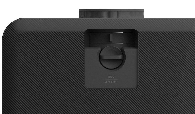 De UHD370X is voorzien van een lens met wat beperkte zoom (1,3x) en een vrij typische projectieverhouding. Je haalt een 100 inch beeld als de projector ongeveer 2,7 tot 3,5 m van het scherm staat. De lensoffset is 105%, het beeld verschijnt lichtjes boven de lens. Met de verticale lensshift, bediend met een draaiknop boven de lens, kan je daar nog 10% bij doen (enkel verder omhoog, niet omlaag).