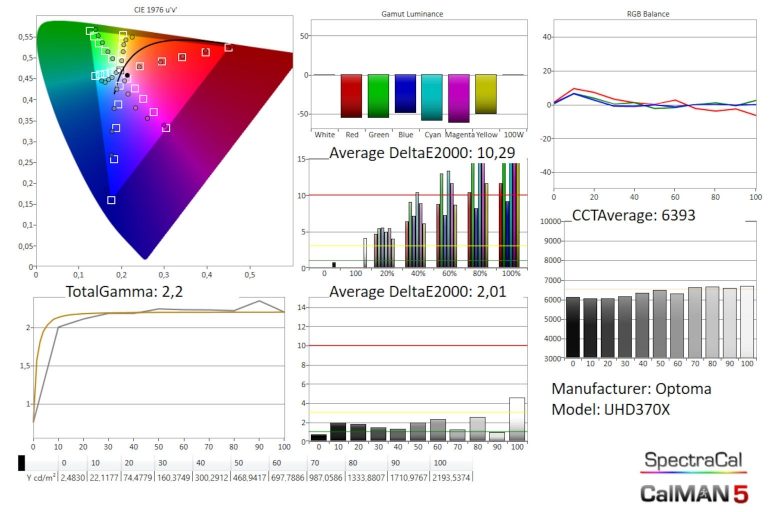 Omdat de User-preset de beste resultaten gaf, gebruiken we die voor onze metingen. We lieten ook Briljant Color geactiveerd, dat representeert het beoogde gebruik van deze projector (kijken bij omgevingslicht). Het resultaat is uitstekend, de grijsschaal is neutraal, de gammacurve prima en enkel de kleuren zijn, zoals verwacht iets te donker. Cyaan en Magenta neigen iets te veel naar blauw maar dat zal je in de praktijk zelden merken.