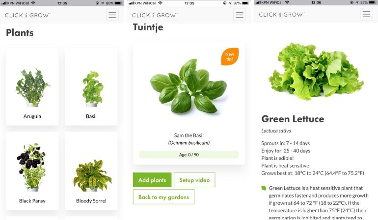 De Click & Grow-app is een extraatje, met name voor diegenen die de Smart Garden intensief willen gebruiken en ook meer over de planten, kruiden en bloemen te weten willen komen. In de app kun je, na het aanmaken van een account, jouw Smart Garden toevoegen. Als je er meerdere hebt kun je er ook meerdere toevoegen. Vervolgens kun je direct na het aanzetten van de Smart Garden aangeven welke planten, kruiden of bloemen je toegevoegd hebt.