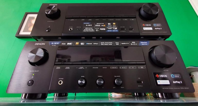 Op het vlak van audio is er voldoende voorzien: twee optische ingangen, een coaxiale digitale ingang en twee analoge cinch-paren. Denon is slim geweest en is de phono-ingang (MM-cartridges) niet vergeten. Onder de motorkap zit een betrekkelijk krachtige versterker van 2 x 100 Watt. In tegenstelling tot bij AV-receivers met veel kanalen zegt dat cijfer wel iets over wat de DRA-800H kan leveren. Het opgegeven cijfer is bij een belasting over het volledige frequentiebereik en op beide kanalen.