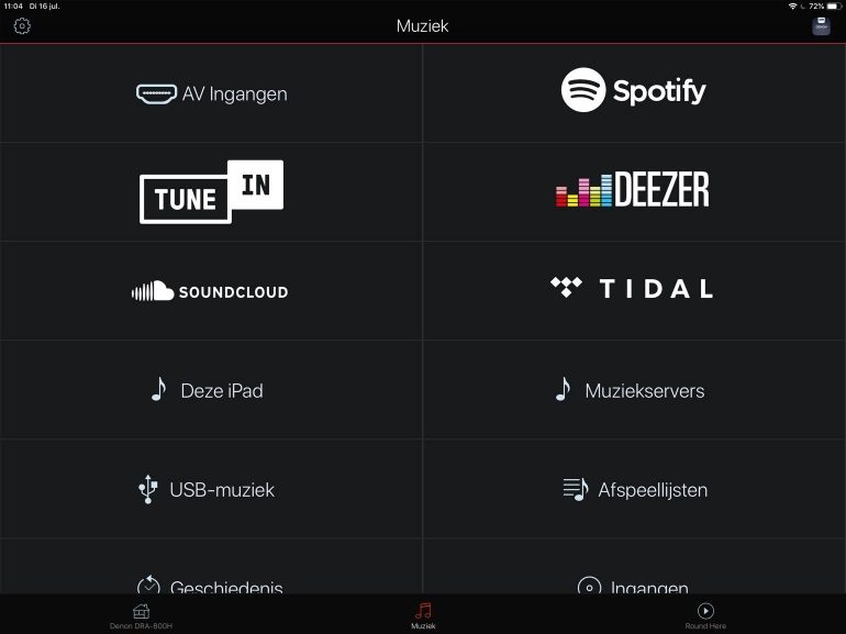 De HEOS-app is sober maar gebruiksvriendelijk: het werkt met drie hoofdschermen (Ruimtes, Muziek en Playing Now). In het eerste zie je de DRA-800H verschijnen, met zijn twee bekabelde zones (luidsprekerpaar A en B). Als je inderdaad twee zones in gebruik hebt, laat HEOS je helaas niet toe om verschillende muziekstreams in elke zones af te spelen. Je kunt enkel de twee zones in/uitschakelen. Bij Muziek zie je alle mogelijke muziekbronnen: Spotify (je schakelt dan over naar de Spotify-app), Tidal, Deezer, Soundcloud, TuneIn-internetradio, servers op het netwerk met eigen bestanden, de muziekbestanden op het mobiel toestel waar de app op draait, en muziek via aangesloten USB-opslag. Via de app kun je ook schakelen tussen de fysieke brontoestellen die via HDMI of een audio-ingang aan de DRA-800HH hangen.