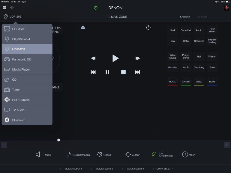 Via de HEOS-app kun je al veel instellen, maar als je dieper wil duiken in de instellingen schakel je over naar de Denon AVR 2016-app die ook voor de surroundreceivers van dit jaar dient. Je vindt in de AVR-app zowel de bediening van de receiver als bepaalde brontoestellen (zoals Blu-rayspelers), afhankelijk van hoe goed ze samenwerken met de HDMI-CEC-standaard. In onze ervaring werkt het bedienen van een speler via de Denon-app eerder niet dan wel, maar dat is ook zo bij de concurrentie.