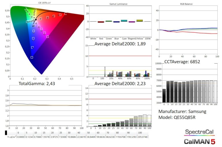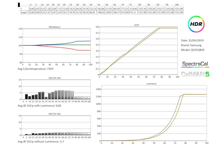 Samsung ondersteunt enkel HDR10+, HDR10 en HLG. Dolby Vision helaas niet. Wat deze tv wel biedt is een erg hoge piekhelderheid. Met 1.246 nits op een 10% venster mevert hij iets en nog 650 nits op een volledig wit scherm levert hij minder dan de Q90R (1.640 nits) maar nog steeds meer dan voldoende om zich bij de absolute top plaatsen. Ook op een volledig wit scherm haalt hij met 650 nits een topresultaat. Het kleurbereik klokt af op 93% DCI-P3 en 69% Rec.2020, net zoals de andere QLED modellen dit jaar, iets lager dan vorig jaar.