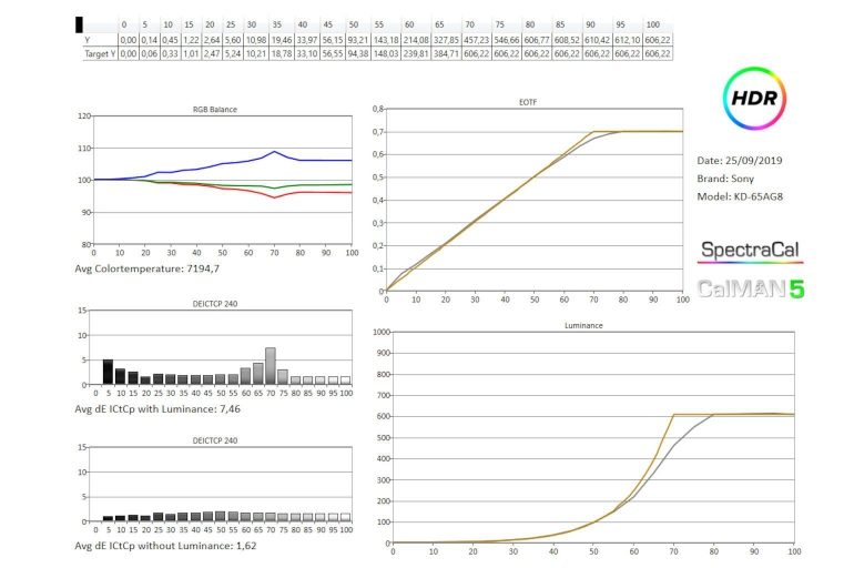 De basisprestaties lijken ons perfect gelijk te lopen met Sony’s andere OLED-modellen., maar iets lager dan de AF8 van 2018. Op een 10% window haalt hij op 654 nits (in de Bioscoop Pro mode), en op een 2% venster kan hij pieken naar 791 nits. Een volledig wit scherm klokt af op 176 nits. Het kleurbereik is onveranderd: 97% DCI-P3 en ongeveer 70% Rec.2020.