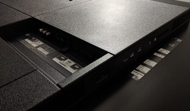 Elektronica en aansluitingen verschuilen zich in het verdikte deel achteraan, dat rondom rond voorzien is van openingen voor verluchting. Zelfs met een totale dikte van amper 51 mm kunnen we dit een erg slank toestel noemen.