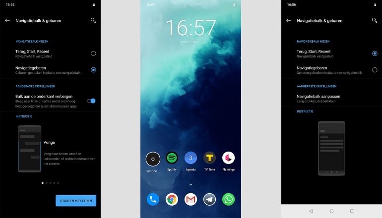 Vind je dat toch niets? Geen probleem. Via de instellingen van je apparaat kun je een andere navigatiemanier selecteren. Daarvoor ga je naar Instellingen > Knoppen & gebaren > Navigatiebalk & gebaren, waar je het kopje Navigatiebalk kiezen zien staan. Hieronder staan, afhankelijk van je telefoon, twee of drie opties. Wij hebben dit getest op de OnePlus 7T en OnePlus 7T Pro, dus de namen voor de menuregels kunnen net even anders zijn. Als je binnen de instellingen zoekt op ‘navigatie’ dan vind je ook wat je zoekt.