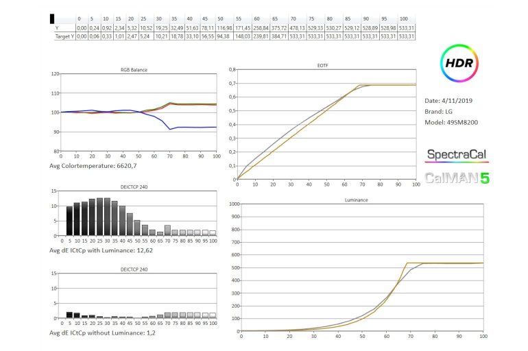 De kalibratie van de 49SM8200PLA is goed, met vrij zuivere kleurweergave. De helderheidscurve toont wel dat lage en middentinten veel te helder getoond worden. Gezien de ideale kijkomstandigheden voor dit toestel toch wat omgevingslicht veronderstelt tillen we daar niet al te zwaar aan.