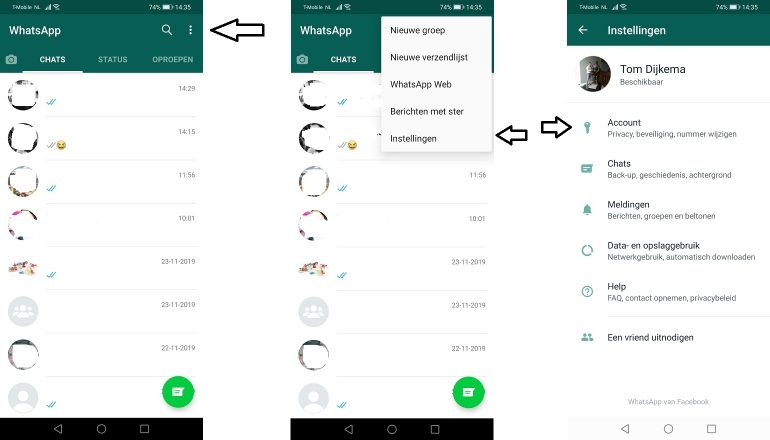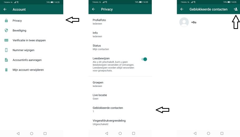 Open WhatsApp en zorg dat je in het menu bent waar al je chats staan. Dit kun je herkennen doordat bovenin de balk ‘Chats, Status en Oproepen’ te vinden is. Rechtsboven in je scherm zie je drie verticale stippen. Druk hierop en klik op Instellingen. Kies vervolgens voor de bovenste optie ‘Account’ en druk vervolgens op ‘Privacy’. In dit scherm moet je helemaal naar beneden scrollen. De één na laatste optie is ‘Geblokkeerde contacten’. Druk hierop. Hier vind je een lijst met alle tot nu toe geblokkeerde contacten. Wil je iemand toevoegen? Druk dan rechtsboven op het icoontje met een poppetje en een plusje. Nu vind je je contactenlijst terug. Klik simpelweg op een contact om deze te blokkeren.