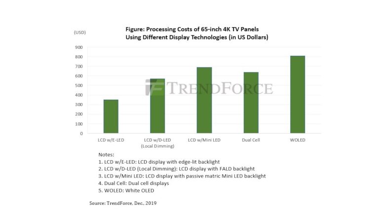 Uiteraard draait de eventuele doorbraak van deze technologie ook rond kostprijs. Op dit moment lijkt de prijs van dual layer LCD ergens tussen een klassieke FALD LCD-tv en een OLED-tv te liggen, volgens de analysten van Trendforce (opgelet, aangeduide prijzen zijn enkel voor het paneel, niet voor de afgewerkte tv). Zij schatten de prijs ook iets lager in dan die van een mini-LED tv.