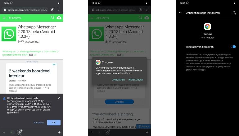 Stel dat je een apk-bestand (een installatiebestand voor Android-applicaties) vanuit Chrome downloadt en je hem wil installeren, dan gaat dat helaas niet zomaar. Neem bijvoorbeeld de meest recente versie van WhatsApp, die een donkere modus toevoegt. In dat artikel zeggen we dat je het apk-bestand kunt downloaden van APK Mirror, een betrouwbare website vol nieuwe versies van een groot aantal Android-apps. Maar zodra je op de link klikt, dan zal Android waarschuwen dat het gevaarlijk is om zomaar bestanden te downloaden.