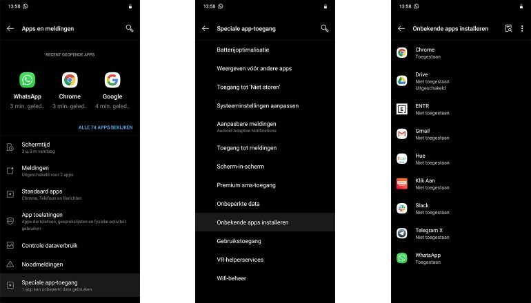 Op Android kun je applicaties op twee manieren installeren: vanuit Google Play en vanuit andere bronnen. Voorheen was het zo dat je met één schuifregelaar kon aangeven dat je het prima vindt wanneer apps vanuit onbekende bronnen geïnstalleerd worden. Maar voor latere versies van Android, waaronder Android 10, gelden er weer andere regels. Als je de nieuwste versie van het besturingssysteem op je smartphone of tablet hebt staan, dan moet je namelijk per app goedkeuring geven of die iets mag installeren of niet.