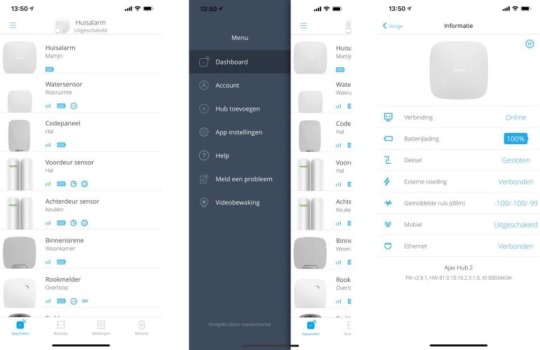 De plek waar je alles regelt, instelt en (mogelijk) bedient is de AJAX-app. Deze app is een verademing als we het vergelijken met apps van andere alarmsystemen die we getest hebben. In perfect Nederlands wordt alles duidelijk getoond, de app is heel overzichtelijk vormgegeven en het instellen en bedienen van het alarm gaat zeer soepel.