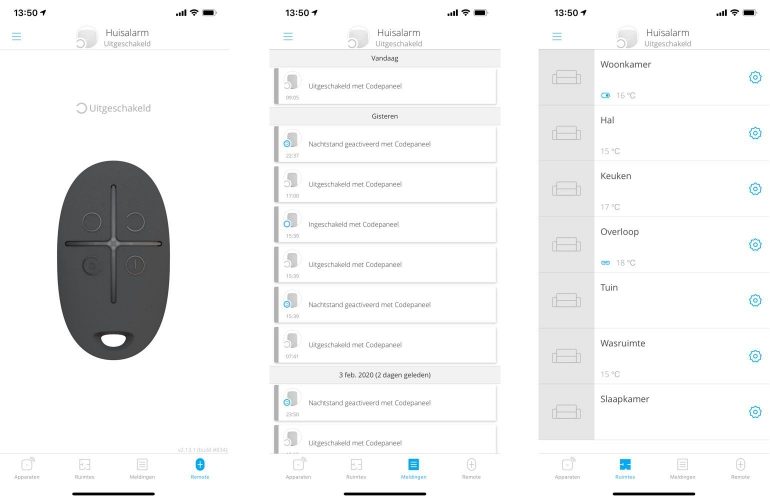 Als je de app opstart kom je meteen op de Remote-tab terecht, waar je het alarm kunt bedienen. Deze remote is exact hetzelfde als de fysieke remote, inclusief aan, uit, nachtmodus en paniekknop. De tab daarnaast is het logboek. Hier kun je zien wat er gebeurt, welke sensor een melding geeft en wie het alarm bediend heeft. De derde tab is de Ruimtes-tab, waar je een overzicht per ruimte krijgt, inclusief temperatuur (waarover later meer). Elke ruimte kun je een eigen naam en afbeelding meegeven.