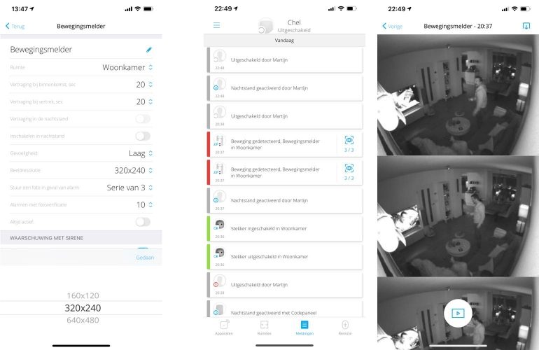 Dat gezegd hebbende is de 320×240 resolutie voldoende om te zien wat er gebeurt in huis, om vervolgens hierop te reageren. Het is niet bedoeld om gezichten tot in detail te kunnen herkennen, maar juist om te kunnen zien of het alarm vals of terecht is. De foto’s zijn van voldoende kwaliteit om met veel of weinig (of geen) licht duidelijk te zien wat er gebeurt. In de app kun je zelf aangeven hoeveel foto’s je per beweging wilt ontvangen (standaard 3) en hoe vaak je foto’s wilt maken van een beweging tijdens een alarmering. Tot slot beschikt de MotionCam over een gevoeligheidsinstelling van laag tot hoog. Mocht je huisdieren van maximaal 50cm hoog en 20 kilo zwaar hebben dan worden ze met de ‘laag’ instelling genegeerd, en dat werkt zeer goed. Personen die rondlopen worden direct herkend, terwijl de kat zonder problemen zijn rondje door het huis kan maken.