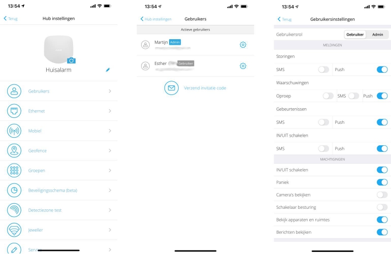 Een alarm is geen slim alarm wanneer je niet met verschillende gebruikers kunt werken. Via de app kun je dan ook eenvoudig meerdere gebruikers (maximaal 50) toevoegen. Je kunt deze gebruikers zelf beperken qua mogelijkheden. Zo kun je bepalen welke notificaties en hoe zij notificaties ontvangen en kun je aangeven welke schermen de gebruiker mag zien en aanpassen. Elke gebruiker kan ook zijn eigen alarmcode (voor uitschakelen en inschakelen) aanmaken, en een eigen dwangcode instellen. Wanneer elke gebruiker zijn eigen codes gebruikt op het KeyPad dan zie je in het logboek exact terug wie wat gedaan heeft.