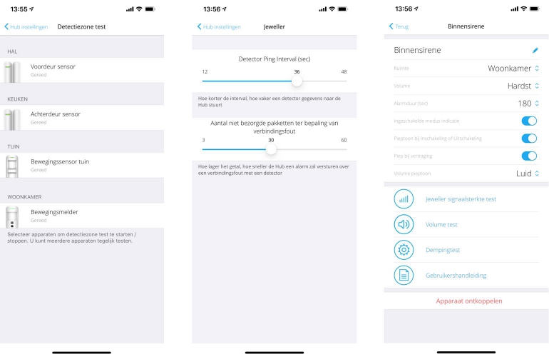 Tot slot is er de Apparaten-tab, waar je een duidelijke afbeelding van elk apparaat ziet en middels icoontjes aangegeven wordt wat de batterijstatus is, wat de signaalsterkte is, of het apparaat een vertraging heeft bij inschakelen/uitschakelen en of het apparaat actief is in de nachtmodus. Klik je op een apparaat dan kom je in een overzicht met meer details, waaronder de status van de deksel (is de achterzijde van de sensor geplaatst?) en het percentage van de batterij. Via het tandwieltje kom je vervolgens in de aan te passen instellingen, die per apparaat verschillen. Ook kun je vanuit dit scherm de signaalsterktetest en de detectietest doen.