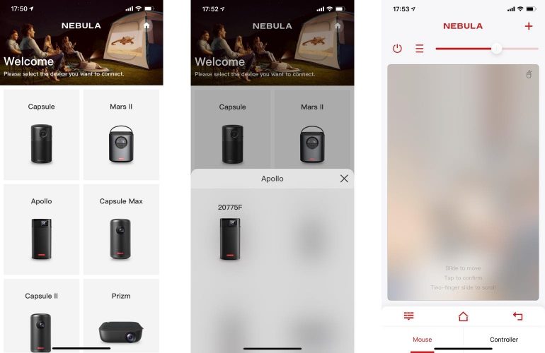 Je kunt de Nebula Apollo op drie manieren bedienen: via het touch-paneel aan de bovenzijde, de meegeleverde afstandsbediening en de Nebula Connect-app. De bediening via het touch-paneel is de minst gebruiksvriendelijke. Het werkt, maar soms worden drukken of vegen niet helemaal goed herkend. Je kunt de keuze om je vinger als muis te gebruiken en dus een pijltje over het scherm te sturen, of je kunt de projector bedienen middels touches en swipes. Het ligt maar net aan de interface waar je inzit wat fijn en niet fijn werkt, en niet alle apps ondersteunen beide mogelijkheden. Zo ondersteunt Netflix alleen de bediening middels de pijltjes (swipes en touches). Via de applicatie voor je smartphone is de bediening iets eenvoudiger omdat je smartphone simpelweg beter met touch-bediening om kan gaan. De functionaliteit blijft hetzelfde: je kunt je vinger gebruiken als muis of de projector middels swipes en touches (boven, beneden, links, rechts, enter) bedienen. Wel heb je via de app de mogelijkheid om eenvoudig via een keyboard tekst in te voeren en zijn er snelkoppelingen voor het bedienen van het volume. Het meest eenvoudige is de bediening met de meegeleverde afstandsbediening. Echter, het invoeren van teksten gaat hiermee weer wat lastiger.