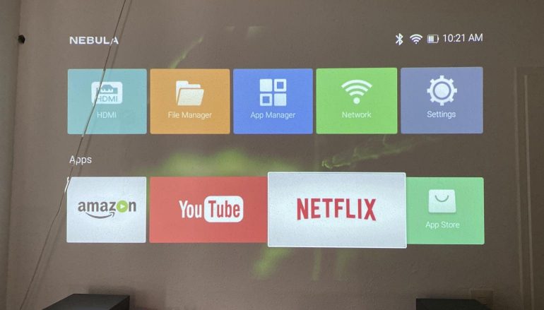 Zodra je de Nebula Apollo aanzet zie je meteen dat je met Android te maken hebt, al is het met Android 7.1 al een wat oudere versie. Standaard is er een aantal apps geïnstalleerd, waaronder YouTube, Amazon Video en Netflix. Wat ook meteen opviel toen we meer apps gingen zoeken is dat je geen toegang krijgt tot de officiële Google Play Store. Je moet het doen met Aptoid TV en dat is maar een mager gevulde app store. Populaire apps van onder meer Videoland, de NPO of Pathé Thuis hoef je hier niet te verwachten. Wel kwamen de apps van Spotify, Plex en VLC voorbij, maar dan heb je het wel gehad. Via omwegen (bijvoorbeeld via Chromecast) kun je andere videodiensten bekijken, maar dit apparaat is vooral interessant voor diegenen die YouTube, Netflix, lokaal opgeslagen video’s of materiaal uit hun eigen netwerk bekijken. Een bron aansluiten via HDMI zullen de meesten niet doen met een draagbare projector.