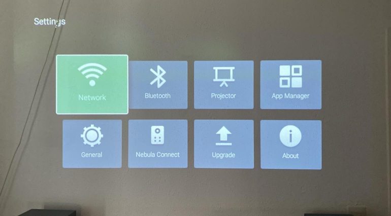 Qua instellingen heb je een hoop opties om het systeem en de weergave naar eigen wens in te stellen. Naast de keystonecorrectie-mogelijkheden kun je de kleurtemperatuur instellen en de beeldmodus instellen. Je hebt hierbij de keuze uit auto-, standaard- en batterijmodus. Bij de eerste en laatste modus wordt de helderheid iets omlaag gehaald voor 4 uur aan batterijduur. Wil je de maximale helderheid en 3 uur aan kijkplezier, dan kies je de standaardmodus. Ook komt Nebula Apollo met een aantal algemene instellingen om bijvoorbeeld de taal (geen Nederlands, wel engels) en de achtergrond in te stellen. Een draadloze bluetooth-speaker kun je koppelen middels de bluetooth-opties en de WiFi-optie laat je verbinding maken met je eigen netwerk. De installatie verloopt vrij soepel, zonder het aanmaken van een account.
