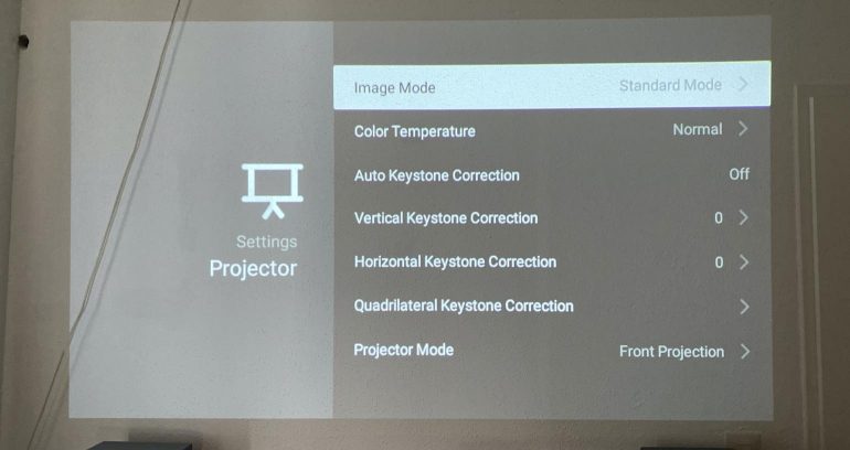 Je hebt zoals gezegd nog wat instellingsmogelijkheden voor de weergave, en wat dat betreft zijn we met name onder de indruk van de keystonecorrectie. In één opstelling hebben we de projector naast het bed gezet om schuin op de muur een beeld van zo’n 40-inch te projecteren. Met wat aanpassingen aan de keystone-opties was daar echter snel een (bijna) perfect beeld van te maken.
