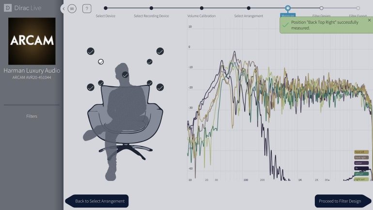 De verschillende fabrikanten van AV-receivers gebruiken kalibratiesoftware die ze zelf uitvonden of elders kochten. Arcam – net zoals NAD, Lexicon en anderen – kiest voor de software van Dirac, een Zweeds bedrijf dat zijn audiosoftware eveneens verkoopt aan automerken zoals BMW, Volvo en Bentley. Ook autointerieurs zijn lastige omgevingen om een goede klank te krijgen. De keuze voor Dirac vinden we een goede, want volgens ons is deze software van de beste beschikbaar. Toegegeven, het gebruiken is zelfs met de nieuwe Dirac Live 2.x-generatie nog altijd moeilijker dan de meeste alternatieven. Gelukkig is Dirac met versie 2.4 iets royaler met uitleg, zodat je toch beter weet waar het om draait bij het meten. Dat meten doe je met een meetmicrofoon die je verbindt met een laptop waarop Dirac draait. Het is ook mogelijk om via een mobiele app te werken, maar dat is minder krachtig dan via de volledige app.