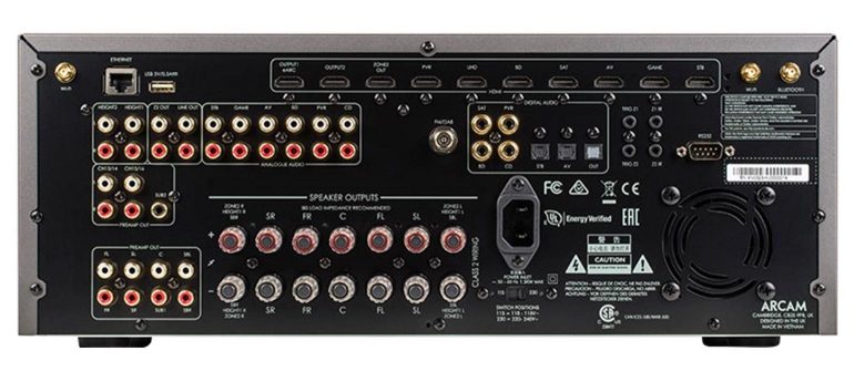 Achteraan worden we geconfronteerd met aansluitingen die helder en ruim zijn geplaatst. Je gaat niet zuchten als je bronnen en speakers op aansluit, want het is echt op een makkelijke installatie voorzien. Dit is wel Arcam, wat betekent dat het centerkanaal in het midden van de luidsprekeraansluitingen staat, met alle linkse kanalen links en alle rechtse kanalen rechts. Bij veel receivers staat center helemaal links en volgen de speakers in hun traditionele groepen met L en R samen (front, surround, rear surround, height). Zoals je zou verwachten op dit niveau ontbreekt er eigenlijk niets qua inputs. Er zijn drie HDMI-outputs (met één eARC-compatibele) en zeven inputs, allemaal HDMI 2.0b. Audio-ingangen ontbreken ook niet, zowel digitaal als analoog. We zijn wel wat verrast door het ontbreken van een phono-ingang. Misschien wordt dat gezien als iets dat niet past bij een meer professionele thuisbioscoop.