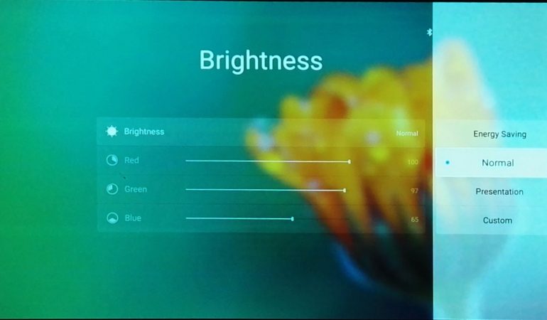 De beeldinstellingen die je via de instellingen bereikt geven je bijvoorbeeld nauwelijks de mogelijkheid om iets aan te passen. Je vindt er in de eerste plaats de instellingen voor keystone en focus. Verder is er enkel ‘brightness’ waarmee je de lamp-instelling aanpast. Er is keuze uit drie modi (respectievelijk van de laagste lamp-stand naar de hoogste: Energy Saving, Normal en Presentation) maar die beïnvloeden helaas ook de kleurtemperatuur. Er is een vierde modus, ‘Custom’, die je kunt aanpassen via RGB-niveaus. Er is geen aparte grijsschaalregeling voor de donkere of heldere tinten en een gevorderd kleurbeheersysteem ontbreekt.