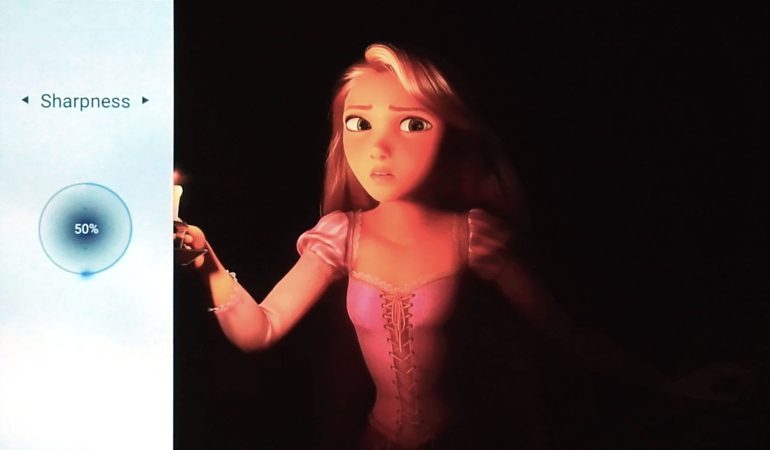 Het Full HD beeld mist de fijnste verticale resolutie, en in de ingebouwde beeldpresets is de scherpte wat te hoog, waardoor je hier en daar vals detail ziet. Omdat de projector geen opties heeft om ruis weg te werken, kan die overmatige scherpte ook ruis accentueren. Kies daarom voor de ‘User’ beeldpreset en beperk vervolgens ‘Sharpness’ tot ongeveer 30.