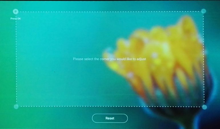 Maar zelfs als je de projector niet horizontaal perfect centraal voor het scherm zet, en je wat schuin naar links of rechts moet projectoren, kan je nog een correctie uitvoeren. Door vier punten naar de gewenste plaats te slepen met de afstandsbediening werk je tegelijk horizontale en verticale trapeziumvervorming weg.
