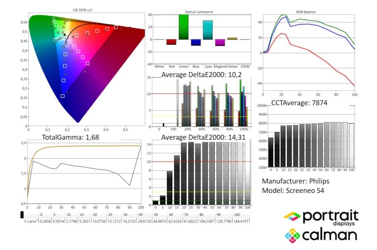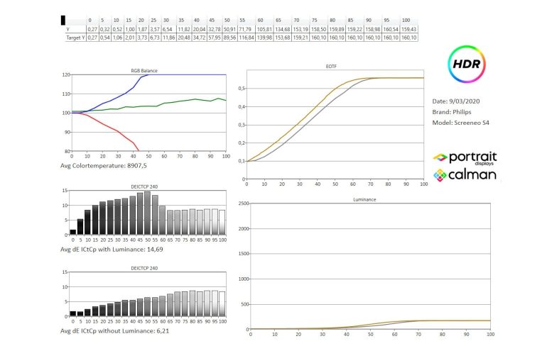 De beste resultaten kregen we in de ‘Normal’ lampmode en de ‘Natural’ beeldpreset. De kleurtemperatuur is dan nog steeds veel te koel (cyaan overtoon). De preset heeft (net als de andere beeldpresets) een erg lage gamma waarde, waardoor het beeld erg helder is in de middentonen. Bij de kleurweergave valt dan weer op dat de meeste kleuren te intens zijn. Vooral rood en blauw (en dus ook magenta) zijn uitgesproken te sterk.