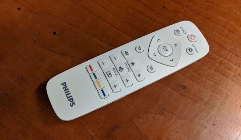 De kleine remote ligt licht in de hand en de toetsen werken handig. De enige wat opvallende optie is de aanwijzerfunctie. Druk je op de ‘pijl’ toets (rechts naast Home), dan zie je een aanwijzer op het scherm die je verplaatst door de remote licht te bewegen. Best handig in de Android omgeving, maar nu ook weer geen groot pluspunt. De remote is niet verlicht, maar deze projector gebruik je vermoedelijk toch bij wat licht.
