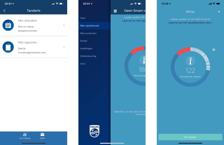 De tab ‘Extra’ geeft je de mogelijkheid om een rapport uit te draaien voor je tandarts, je afspraken met de tandarts te bekijken en je kunt er nieuwe opzetborstels en accessoires voor je tandenborstel kopen. Via het icoontje links bovenin kom je in het menu. hiermee krijg je toegang tot verschillende pagina’s, waaronder de status van je opzetborstel (met resterende sessies voor vervanging) en de producten die je gekoppeld hebt. Weinig spannends dus. Tot slot heb je rechts bovenin de ‘Poets’ knop waarmee je direct naar de tandenborstel kunt laten zoeken en kunt gaan poetsen. Echter, je kunt ook gewoon de tandenborstel zelf oppakken en gaan poetsen.