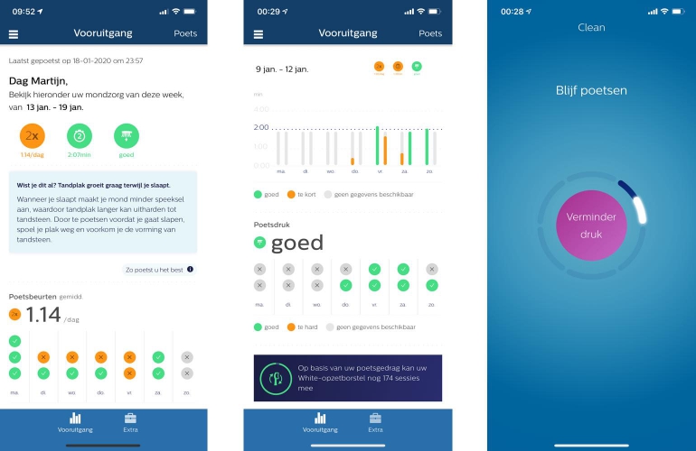 Als we kijken naar het gebruik van de slimme functies dan valt het wat tegen, zeker als we het vergelijken met de DiamondClean Smart en concurrerende tandenborstels zoals de Oral-B Genius X. Beide toestellen hebben veel meer slimme en handige mogelijkheden, waaronder het in real-time meekijken met de poetsbeurt om zo te zien of je alle hoeken van de mond gehad hebt. De Sonicare DiamondClean 9000 (HX9911) is eigenlijk niet eens slim te noemen, want het enige dat je te zien krijg is het aantal poetsbeurten per dag, de tijd die je eraan besteed hebt en of je te hard gedrukt hebt. Dit krijg je in de app bij ‘Vooruitgang’ te zien en elke week krijg je een volledig rapport met al deze informatie. Hier en daar verschijnt een tip om beter te poetsen, maar daarmee is ook alles gezegd.