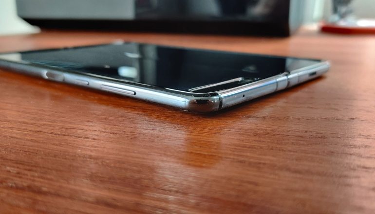 Als we het toestel omdraaien, dan komen we de smalle cameramodule met drie lenzen tegen. Onder die module zit nog een flitser en daar is meteen alles mee gezegd. Achterop zit verder helemaal niets. Het design van de Samsung Galaxy Fold oogt, ondanks of misschien juist dankzij zijn afwijkende formaat, behoorlijk premium. Wat we wel jammer vinden, is dat de behuizing een ouderwetse vingerafdrukmagneet is. En dat kun je niet snel oplossen met een goedkoop hoesje. Dat is toch wel jammer wanneer je naar het toestel kijkt.
