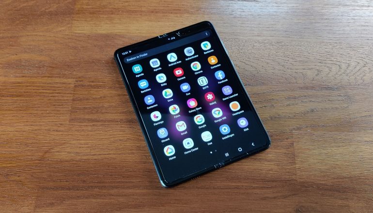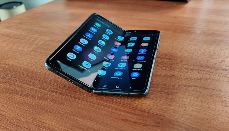 Wanneer we de Samsung Galaxy Fold eenmaal openklappen, dan komt het riante scherm van 7,3-inch tevoorschijn. In principe is heel de binnenkant bedekt met het scherm. Rechts bovenin zien we echter nog een uitgesneden deel waar een dubbele frontcamera in verwerkt zit, wat op zit een beetje zonde van de ruimte lijkt. Maar in principe merk je er weinig van tijdens het gebruik. Ook is helaas de vouwlijn zeer opvallend: voor het aanzicht, maar ook voor het gebruik. Maar dat is iets waar je niet omheen kan bij zo’n product.