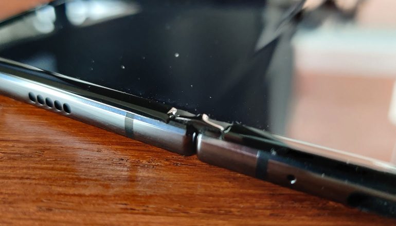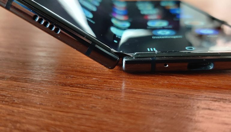 Omdat de metalen onderdelen vlak langs elkaar schuiven, is de telefoon dus niet waterdicht. Houd daar rekening mee wanneer je hem ergen mee naartoe neemt, aangezien een flinke regenbui dus al roet in het eten zou kunnen gooien; om over een bak met water nog maar te zwijgen. Wanneer de Samsung Galaxy Fold dichtgeklapt zit, dan zitten beide delen van het scherm niet helemaal op elkaar: er zit namelijk een kleine opening bij het scharnier en de vouwlijn. Dat komt doordat het scherm niet compleet dubbel te vouwen is.
