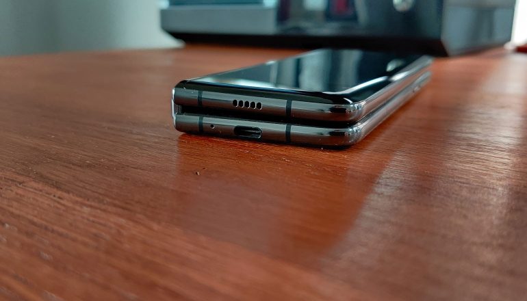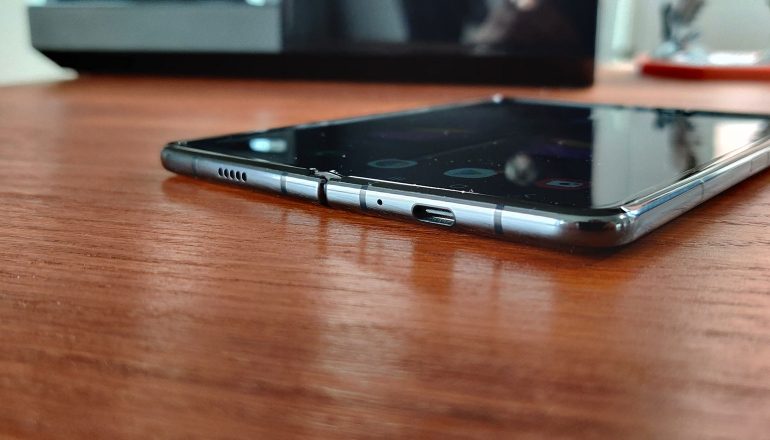 We houden het toestel nog even dichtgeklapt. Voorop zien we dan een klein scherm zitten van 4,6-inch groot. Daarboven zit een speaker en een enkele frontcamera. Je kunt het toestel op deze manier gebruiken als je dat wil, dus je hoeft hem niet altijd open te vouwen als je even snel iets wil checken. Onder- en bovenop zitten twee kleine speakers, terwijl op het andere deel van de smartphone een usb-c-poort zit. Rechts zie je de lade voor de simkaart, evenals de knoppen voor het volume en power. Ook zit hier de vingerafdrukscanner.