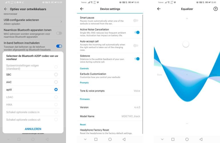 Transparant Hearing was trouwens ook aanwezig op de eerste Momentum True Wireless, maar de noise-cancelling is helemaal nieuw. Je moet er in de app wel even naar zoeken. Voor Transparant Hearing is er een schuifknop in het hoofdscherm, NC moet je zoeken in de instellingen. Gek. Maar je kunt ook activeren door te tikken op je rechteroor.