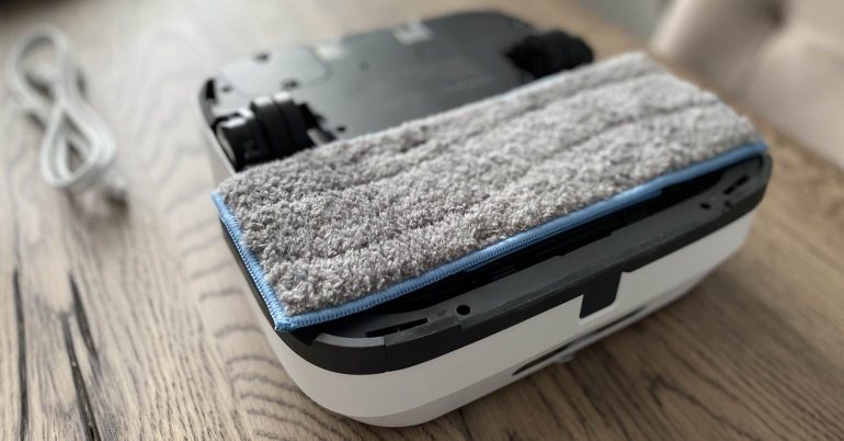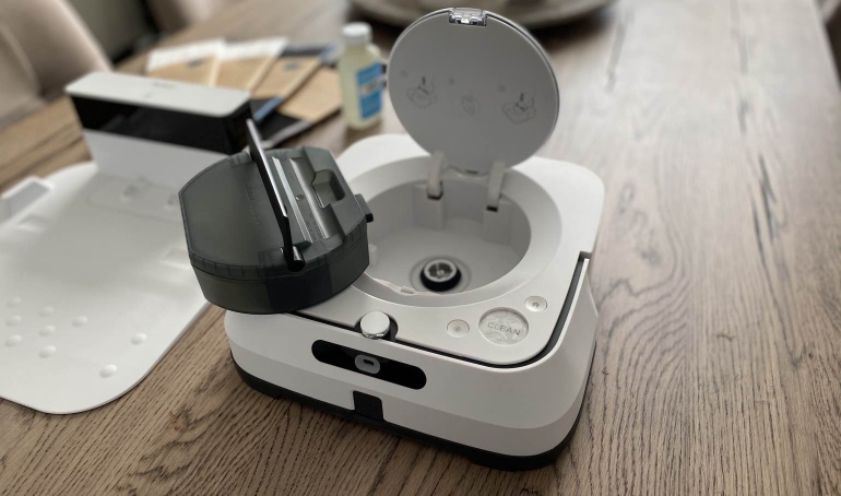 Belangrijk is dat je de hoeveelheid spray en de intensiteit van het dweilen aanpast aan je eigen voorkeuren en je vloer, want bij een te natte dweilbeurt blijven er bijvoorbeeld snel strepen achter aangezien de wielen dan door een plas van water rijden. Ook is het belangrijk dat je de dweil pas zijn werk laat doen als de vloer gezogen is, en het mooi is dat je via de app alles zo kunt instellen dat de robotdweil meteen zijn werk doet zodra de robotstofzuiger klaar is. Dit geldt voor zowel de gehele als een specifieke ruimte. En natuurlijk moet het waterreservoir gevuld zijn. Je kunt het reservoir uitnemen, je doet er wat schoonmaakmiddel in (het flesje dat iRobot meelevert bijvoorbeeld) en je vult het reservoir met water. Met een vol reservoir is onze ruimte (zo’m 20 vierkante meter) bijna twee keer te dweilen. Als je een herbruikbare pad gebruikt dan is het aan te raden om deze na elke dweilbeurt te wassen. Vergeet ook niet het laadstation even met een doekje af te doen want daar blijft veel vuil van de pad op plakken.