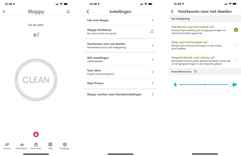Verder zijn er nog diverse extra opties onderin het scherm te vinden. Bij zowel de dweil als de stofzuiger kun je bijvoorbeeld aangeven hoe grondig de robot schoonmaakt. Automatisch, één keer of twee keer voor de stofzuiger, en standaard, diep of groot bereik voor de dweil. Bij de dweil kun je ook nog de hoeveelheid spray instellen en bij de dweil kun je aangeven.