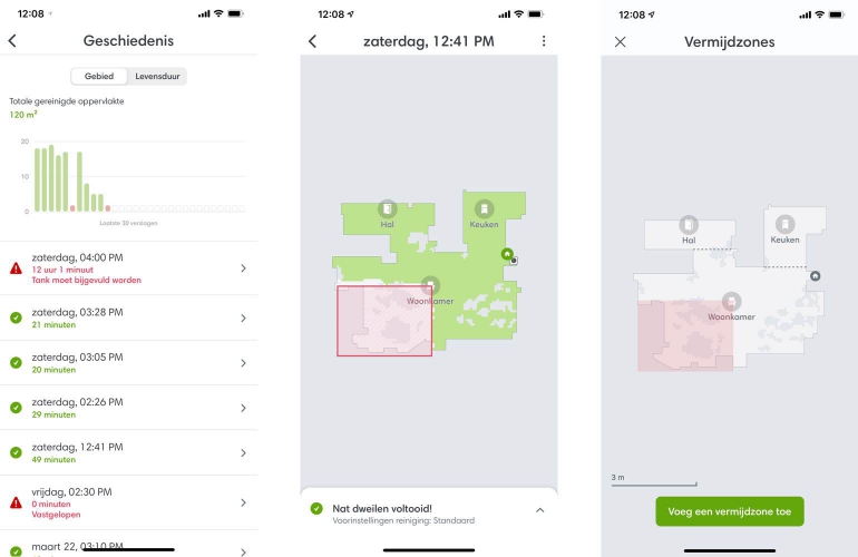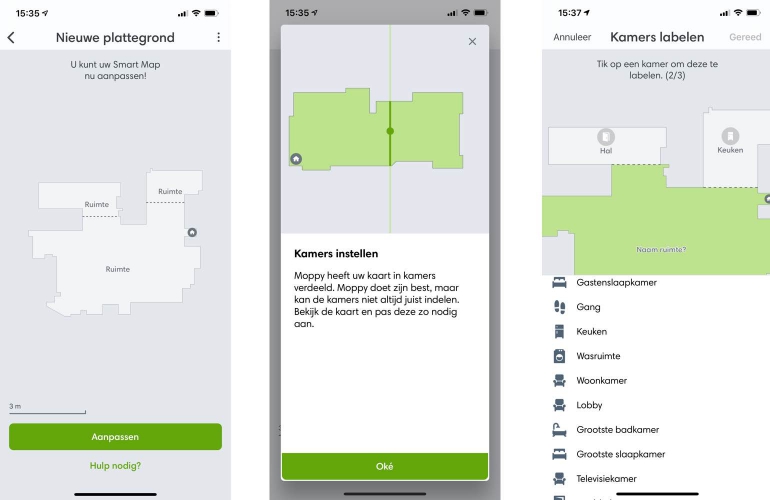 Imprint Smart Mapping is een functie die we al vaker besproken hebben maar die zeker ook nu benoemd moet worden. Kort gezegd zorgt deze functie ervoor dat de robots de eerste 2-4 poetsbeurten de ruimte analyseren en leren kennen. Vervolgens wordt er met al die data in de cloud een slimme kaart (Smart Map) gemaakt en die kaart wordt weer gebruikt om de robot in het vervolg op efficiënte en snelle wijze de ruimte te laten schoonmaken. Je kunt zelf ruimtes binnen de totale ruimte aanmaken en een label geven (keuken, woonkamer, etc.) zodat je via de app ook specifieke ruimtes kunt laten schoonmaken. Deze functie werkt perfect, tenzij je echt met meubels gaat schuiven. Het laat de robots sneller schoonmaken (vergeleken met de Neato die we hebben staan) en je kunt snel na het eten de eetkamer bijvoorbeeld laten zuigen. Zorg er overigens wel voor dat tussendeuren openstaan zodat de robot alles leert kennen en aangesloten ruimten ook kan schoonmaken.