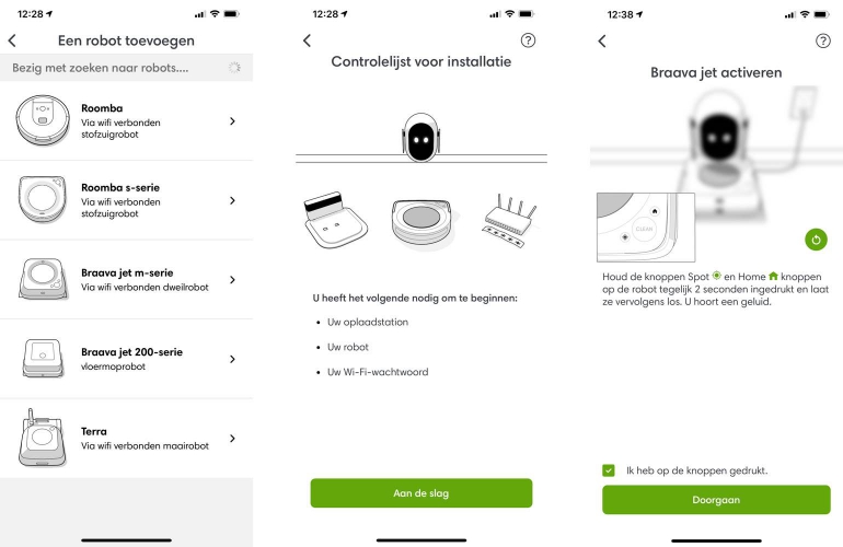 De installatie en de app zijn sinds onze review van de Roomba i7+ nauwelijks veranderd, dus we doorlopen deze elementen kort. De installatie is een fluitje van een cent. Je downloadt de Roomba-app (Android en iOS), maakt een account aan en doorloopt de stappen die je op eenvoudige wijze tonen wat je moet doen. Er wordt direct naar de stofzuiger en/of dweil gezocht en nadat je een WiFi-netwerk hebt ingesteld, de robot een naam hebt gegeven en de software-updates hebt laten installeren kun je direct aan de slag. De robot praat overigens ook tegen je, zelfs in het Nederlands.