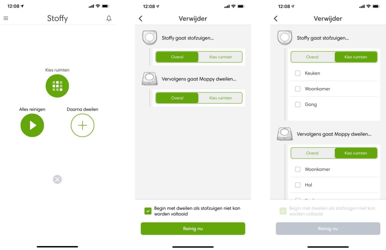 De Roomba-app is een eenvoudige, goed gestructureerde en complete app voor de aansturing van je robotstofzuiger en robotdweil. Het home-scherm is het scherm dat je het meest zult gebruiken, want hier kun je middels de ‘Clean’-knop het zuigen en/of dweilen starten. Als de robot de ruimte reeds geanalyseerd en opgedeeld heeft kun je een specifieke ruimte laten schoonmaken of alles laten zuigen. Heb je een dweil én een stofzuiger dan kun je ze samen aan het werk zetten. Dat betekent dat je eerst de stofzuiger alles of specifieke ruimten laat zuigen, en dat daarna de dweil automatisch alles of specifieke ruimten gaat schoonmaken. Ook vind je op het home-scherm de optie om de opvangbak te laten legen door het basisstation, en zie je wat de status van de accu is.