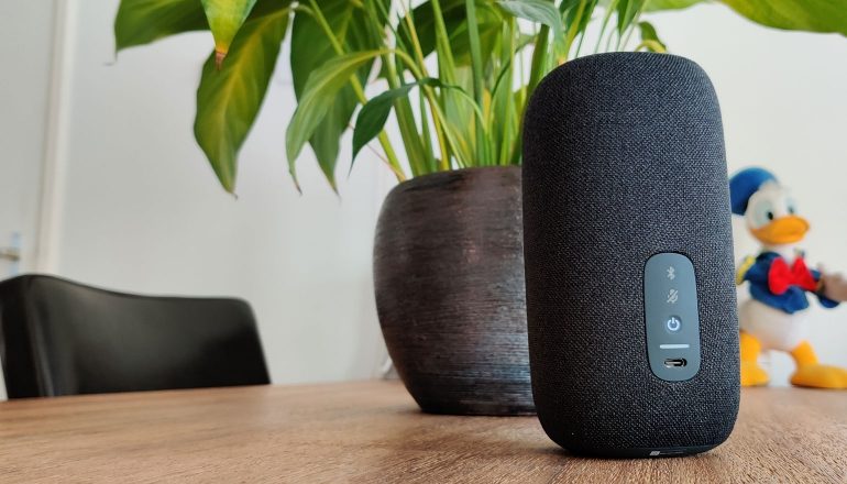 De JBL Link Portable heeft in totaal zes knoppen en twee microfoons. De zes knoppen zijn voor het volume (omhoog en omlaag), de Google Assistent, de bluetoothfunctie en de aan-en-uitknop. Ook is er een knop voor het uitschakelen van de microfoon, voor wanneer je even niet wil dat Google luistert naar je commando’s. Dat kan handig zijn wanneer je al een andere slimme speaker met de Assistent aan boord hebt staan in dezelfde kamer, zoals hier het geval was. Hij stond hier vlak naast de Google Nest Hub op kantoor.
