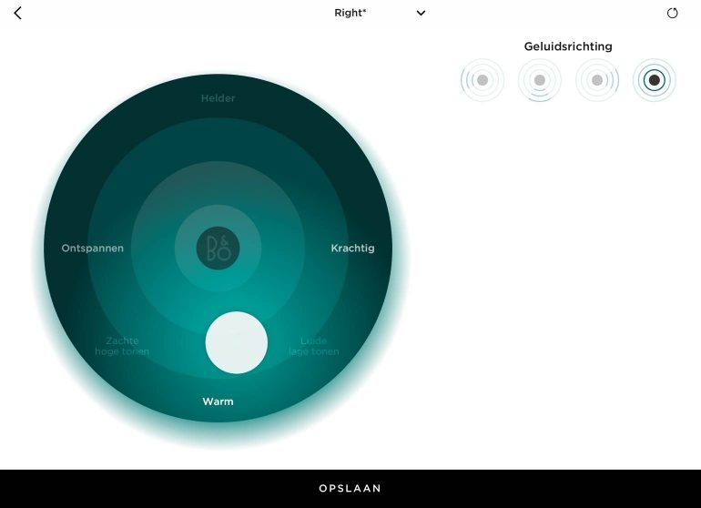 De kamermeting van de Balance probeert akoestische problemen te elimineren, maar dat is niet helemaal hetzelfde als een ideale klank creëren. Bang & Olufsen heeft daar zijn kijk op (en wat ideaal is, blijkt subjectief), maar als je zelf iets anders wil kun je via de app andere geluidsmodi selecteren. Wil je nog een stap verder gaan, dan kun je een eigen geluidsmodus creëren via een cirkelvormige equalizer die makkelijk te gebruiken is. B&O heeft bovendien voor een streepje uitleg in mensentaal gezorgd zodat niet-audiofielen ook weten wat een verandering doet. Goed om weten: niet enkel kun je een bol binnen een cirkel bewegen die ingedeeld is in vier kwadranten, je kunt ook met twee vingers een knijpbeweging uitvoeren om het geluid verder te beïnvloeden.